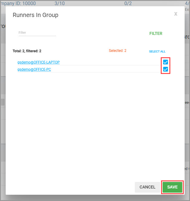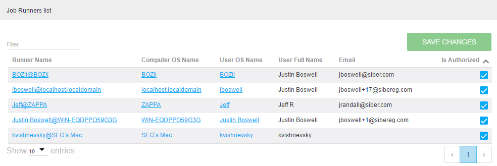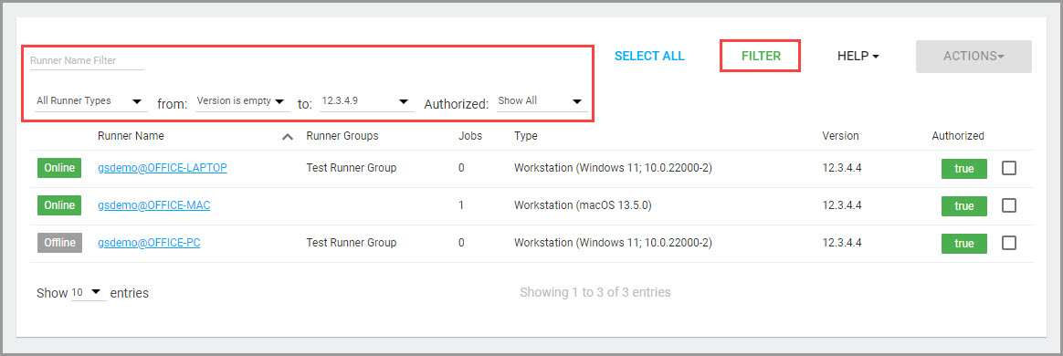 To find the necessary Runners within the List, click the "Filter" button. Filter by Runner Name, Runner Type (Workstation or Server), Runner version, and Authorization status (All/Authorized only/Disallowed only).