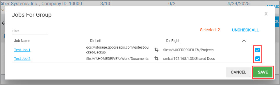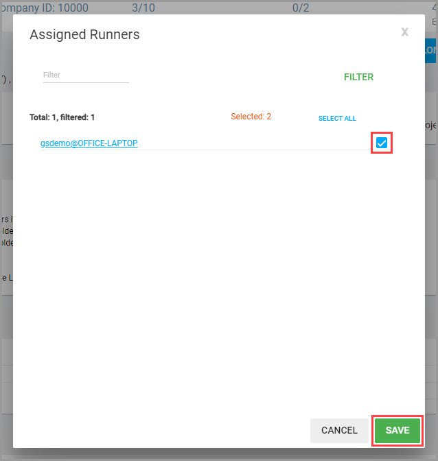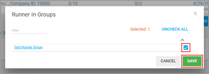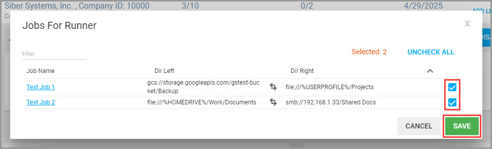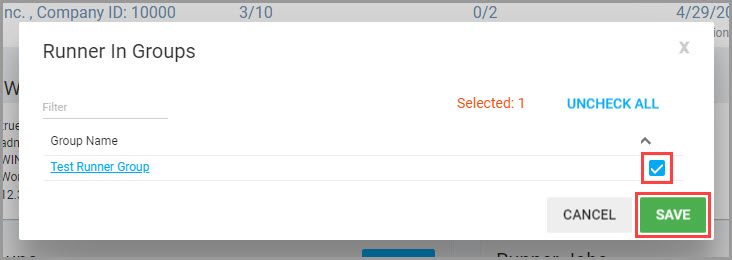 - This presents a list of all Jobs in the Control Center. Check the Jobs to assign to the Runner using the boxes on the right and click "Save" to apply the changes.