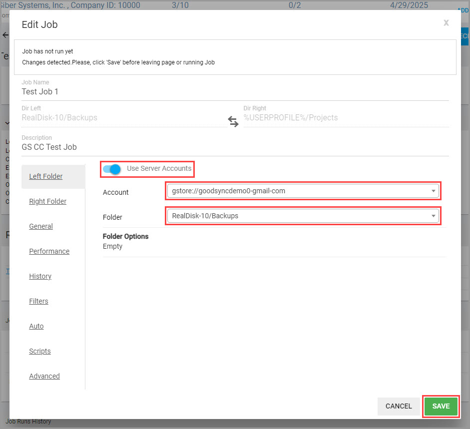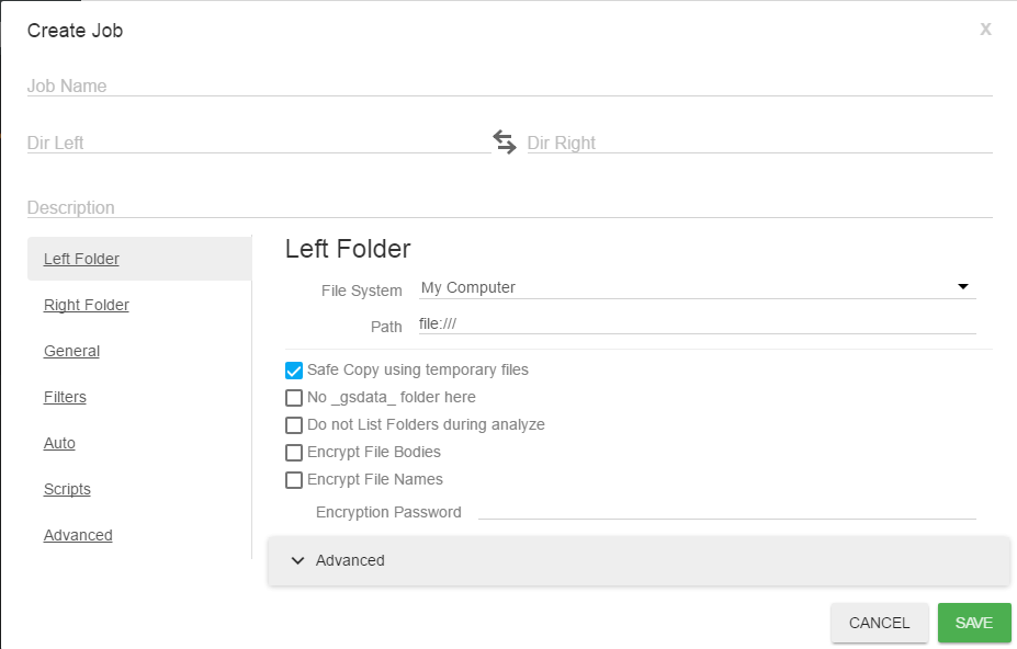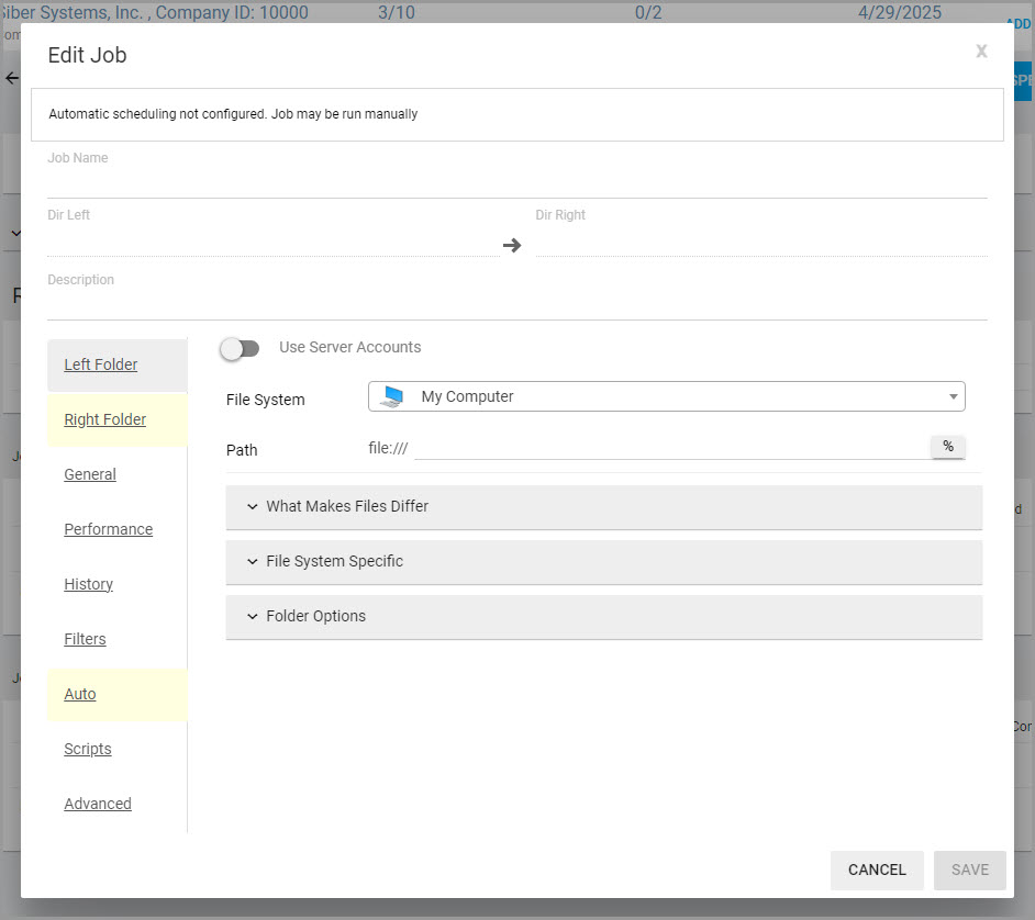Set up the Left and Right Folders for the Job. The File System and Path can be specified manually, or a Server Account can be used.