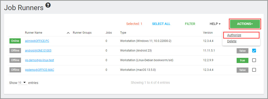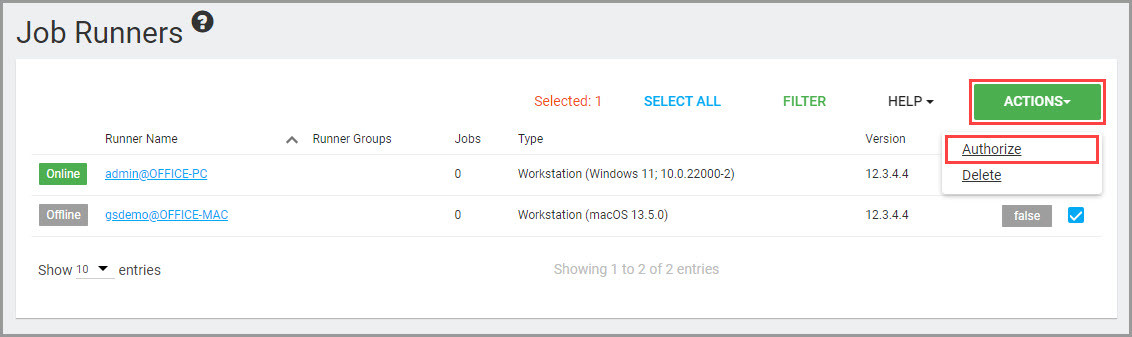 - From the List, check the box on the right corresponding to the newly installed Runner, click "Actions," and select "Authorize" to Authorize Runner so it can get the assigned Jobs.
