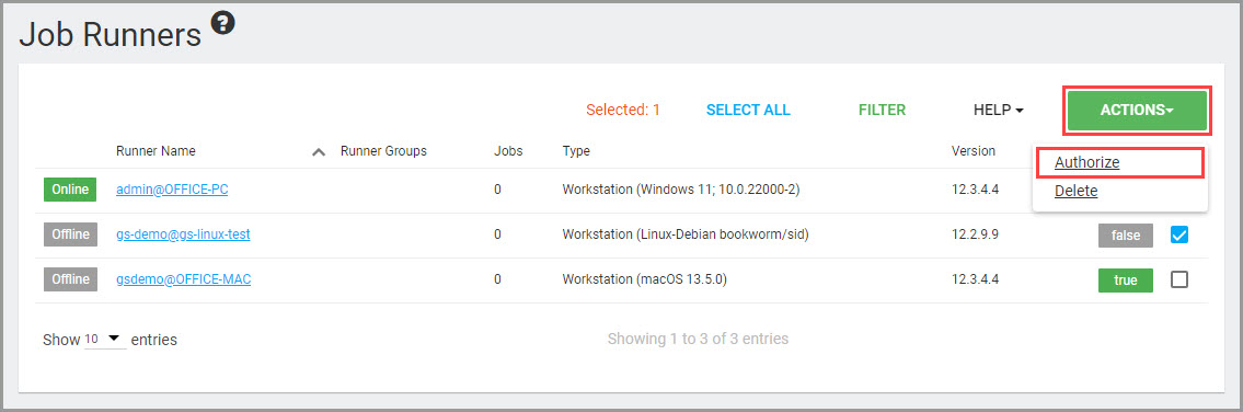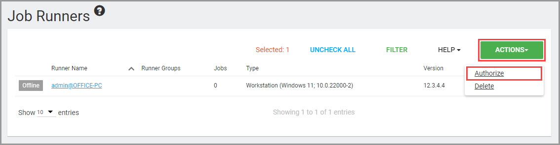 - From the List, check the box on the right corresponding to the newly installed Runner, click "Actions" and select "Authorize" to Authorize Runner, so it can get the assigned Jobs.