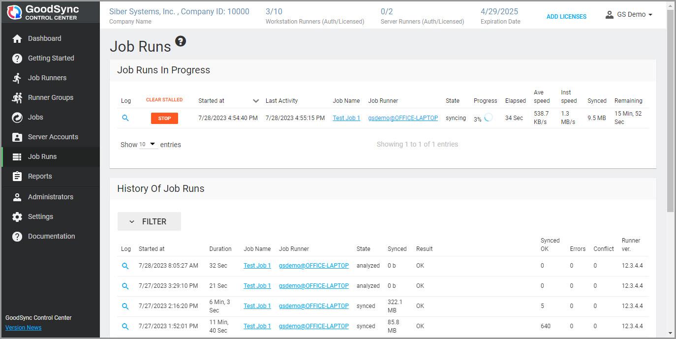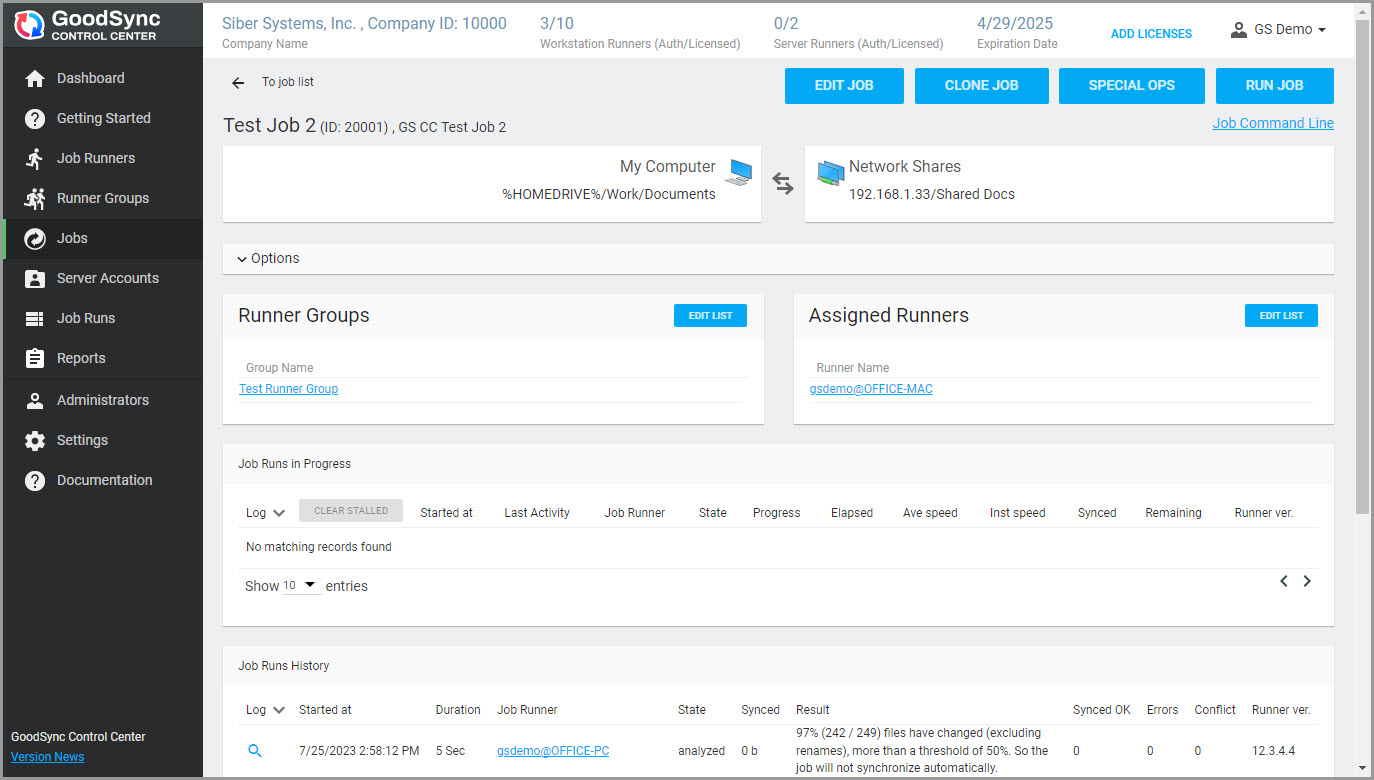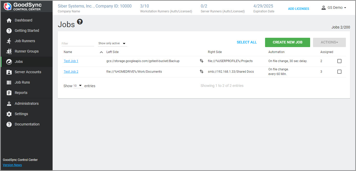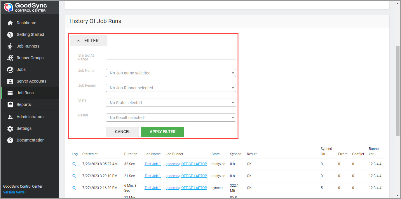 - Jobs lists all GoodSync Jobs available through the Control Center. The Administrator may add/remove and edit all Job Options assign Runners to Jobs. A new and easier way is to create and edit Jobs in a regular GoodSync GUI client, then Sync Jobs to Control Center.