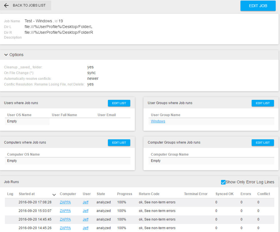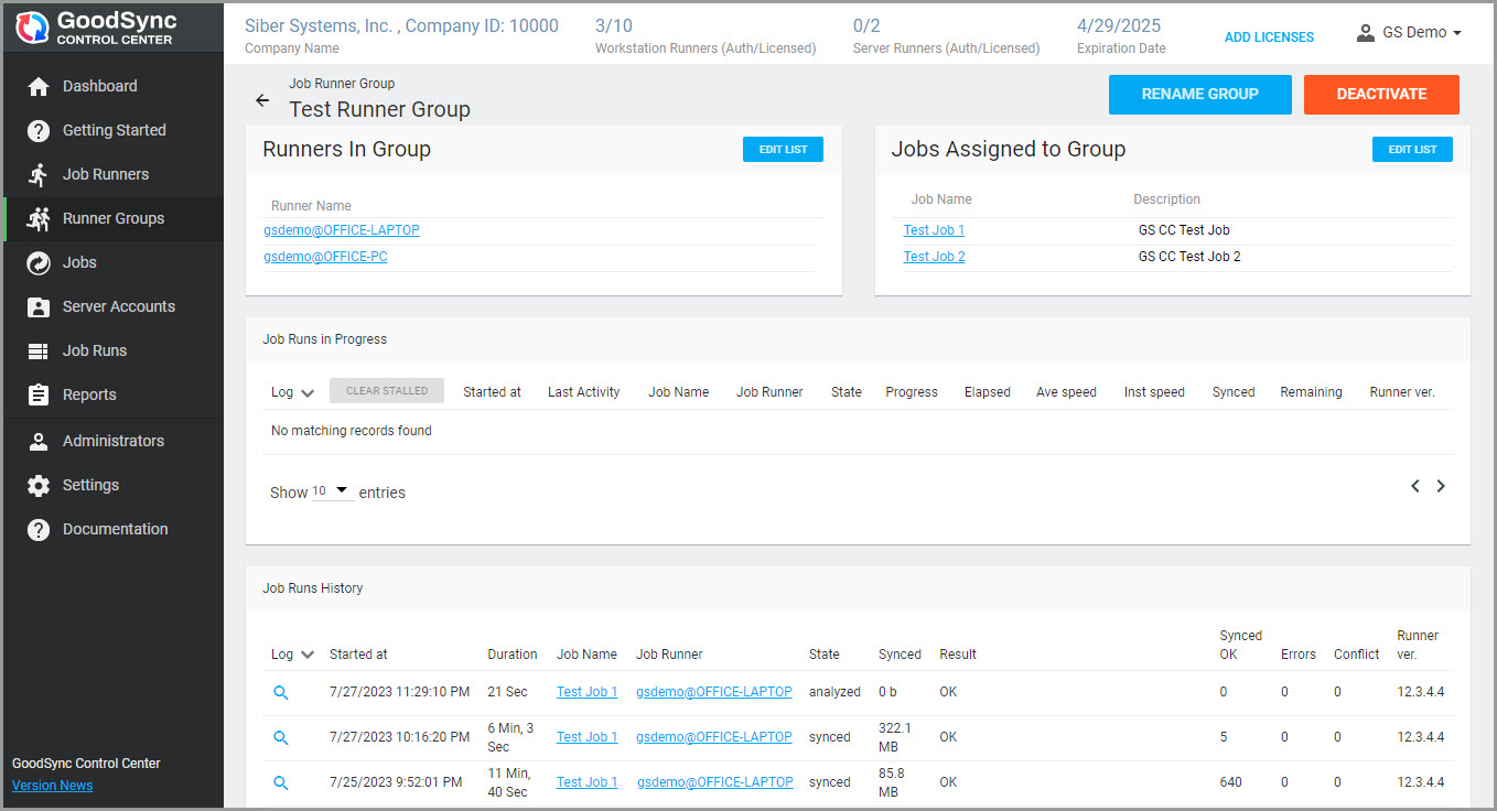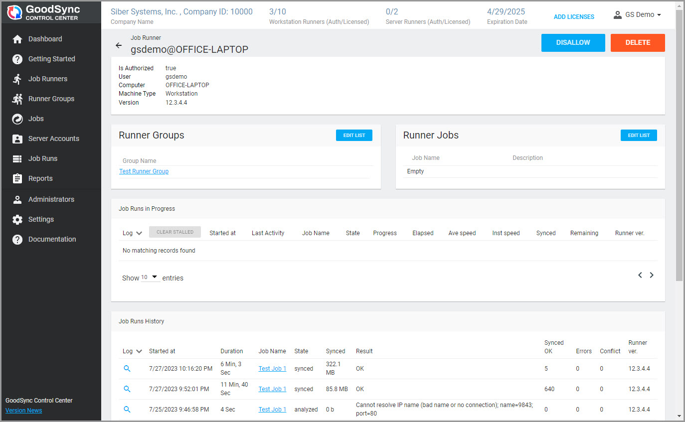 - Jobs lists all GoodSync Jobs available through the Control Center. The Administrator may add/remove and edit all Job Options assign Runners to Jobs. A new and easier way is to create and edit Jobs in a regular GoodSync GUI client, then Sync Jobs to Control Center.