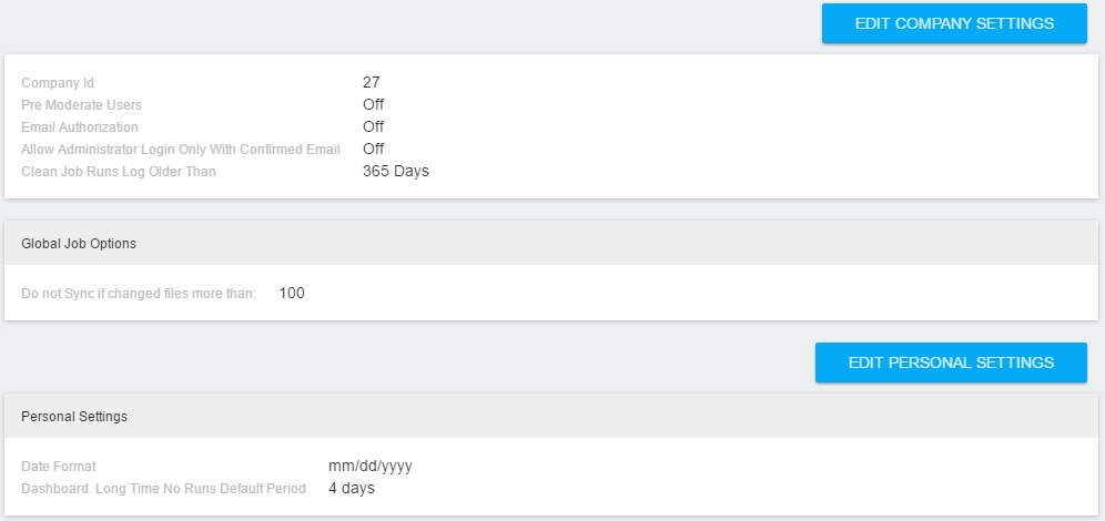 - Settings contain global settings for the Control Center, including Global Job Options, Authorization settings, Administrator settings, etc.