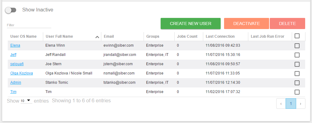The Jobs can be filtered using the "Filter" field and the Jobs status drop-down. By default, only active Jobs are shown. To view all or only deactivated Jobs, click "Show only active" and select "Show All/Show only inactive."